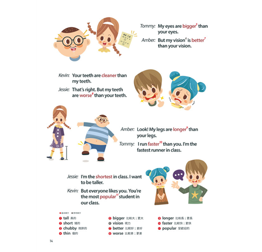 內容字彙主要取自:(1) 教育部國中小基本英語字彙1200字+其他常用800字、(2) 小學英檢」GEPT Kids參考字表、(3) 劍橋英語檢定(YLE)單字表中的單字;文法句型則以國小四-六年級英語課本的句型為主。