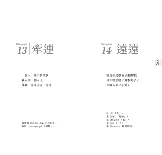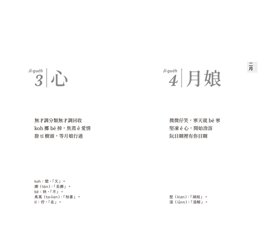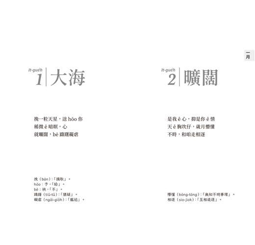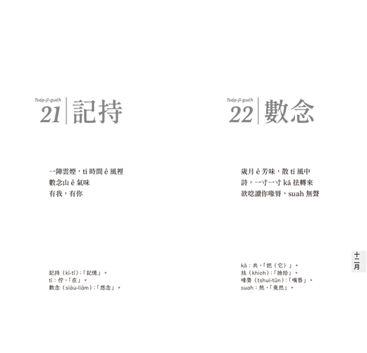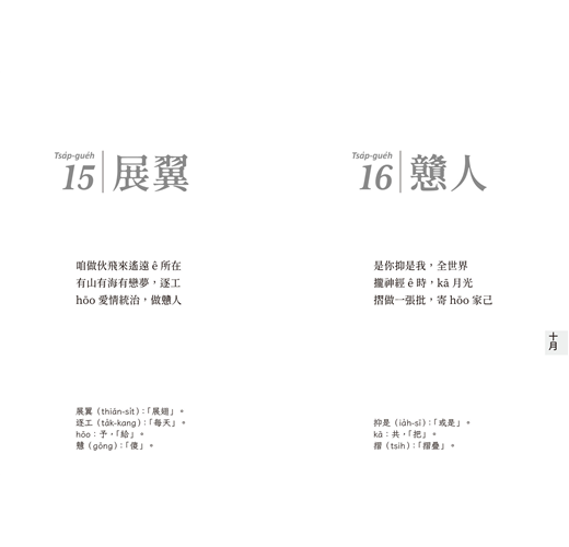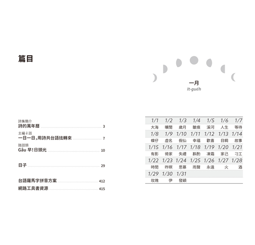 1.仿照日曆形式,一天一首簡單的三行台語短詩。有詩日日陪伴與祝福,昇華日常感受。