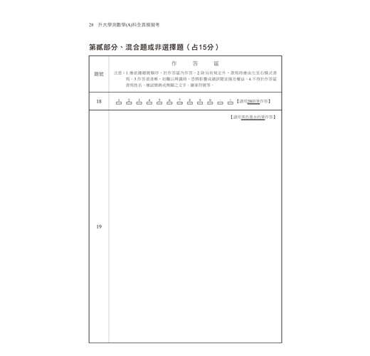 5.111學測具有不同於以往的兩大特色,一是「混合題型」,二是「卷卡合一」。也就是說,除了傳統的選擇(填)題、非選擇題外,111學測將會新增以選擇、選填及非選組成一題組的「混合題型」,也將使用「卷卡合一」的新式答題卷,可依命題需要於答題卷中適當納入部分試題內容,設計對應的作答格式,取代過去分開的答案卡與答案卷,藉由多樣化的設計提升評量層次。