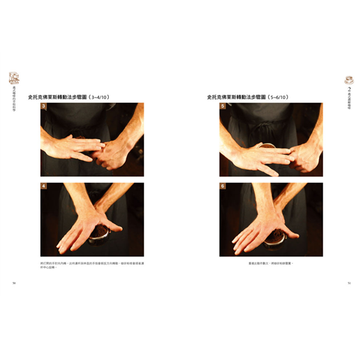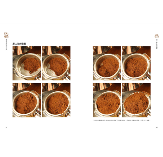 從上述「掌心擋水」的實驗中,大家應該已充分感受到水的威力。一杯理想萃取的義式咖啡,就必須有盡善盡美的咖啡粉餅結構,好讓沖煮水盡可能均勻地通過咖啡粉餅。而這理想的咖啡粉餅建構,占據了義式咖啡操作的前半段重點。書中說明了幾種徒手整粉的經典方法:史托克佛萊斯轉動法(Stockfleth’s Move)與偉斯布粉法(Weiss DistributionTechnique, WDT),都是將原本混亂的咖啡粉重整秩序。