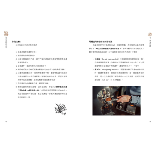 除了帶你看懂原理外,書中亦有許多操作步驟分析,例如「義式濃縮咖啡製作流程」。這些看似條列式的文字指引,可能會讓很多人覺得枯燥或太過填鴨,但我們確實能依照書中說明,做出一杯「不離譜」的義式咖啡。因此,這些步驟,也是我在mojocoffee教育訓練中會實際拿來應用的咖啡操作指引。