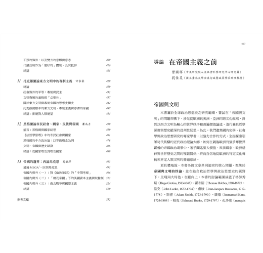 更具體地說,本書各篇文章共同追索的核心問題,聚焦於帝國與文明的悖論,並在結合政治哲學與政治思想史的視野下,呈現兩大特色。在縱向上,本書的討論範圍涵蓋了格勞秀斯(Hugo Grotius, 1583-1645)、霍布斯(Thomas Hobbes, 1588-1679)、洛克(John Locke, 1632-1704)、盧梭(Jean-Jacques Rousseau, 1712-1778)、斯密(Adam Smith, 1723-1790)、康德(Immanuel Kant, 1724-1804)、柏克(Edmund Burke, 1729-1797)、孔多塞(marquis de Condorcet, 1743-1794)、邊沁(Jeremy Bentham, 1748-1832)、黑格爾(Georg Wilhelm Friedrich Hegel, 1770-1831)、托克維爾(Alexis de Tocqueville, 1805-1859)、約翰.彌爾(John Stuart Mill, 1806-1873)、乃至馬克思(Karl Marx, 1818-1883)等,賦予人類政治以「現代」新意之偉大作家的經典文本。就此而言,本書所涉獵的知識版圖,不僅包含英、法、德三大政治哲學傳統,並翔實地勾勒出歐洲近代帝國與文明思想發展的數百年軌跡。