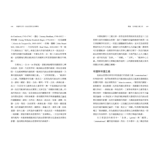 在橫向上,自15、16世紀起,當歐洲強權將其擴張野心轉向美洲、亞洲,乃至世界時,歐洲政治思想的視域,即向全球著眼。在此視域轉換的過程裡,歐洲近代政治思想的發展線索,乃無可避免地與「帝國與帝國主義」、「文明與野蠻」、「歐洲中心主義」等課題密切交織。換言之,正因為現代政治的主要概念,諸如:國家、憲法、自由、權利、平等、公民、商業社會、民主,乃至保守主義與自由主義等等,無一不是源起於近代歐洲,而近代歐洲的政治史實質上又涉足從「帝國到帝國主義」的海外殖民史。因此,從全球政治史的觀點來看,形塑現代政治概念的歷史語境,同時承載著一套有關世界秩序與普遍價值之論述的議題叢結,諸如:自然法、萬民法、政治法、征服、義戰、奴隸、占有、殖民、自由貿易、商業社會、同意、契約、國家建構、法的普遍性與特殊性、國際法、普遍人性、普世人權、民族意識、資本主義、文明進步史觀等等。就此而言,本書最重要的一項貢獻,便是呼應英美思想界的「全球轉向」,立足於東亞學者的視角,來重新檢視歐洲近代政治思想的跨文化意涵及其歷史影響,進而開拓華語政治思想研究的新視界。