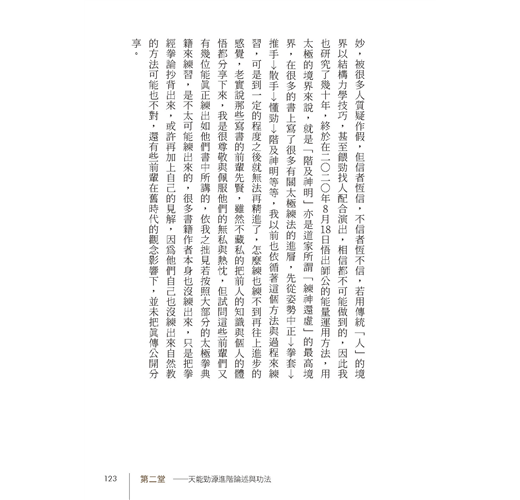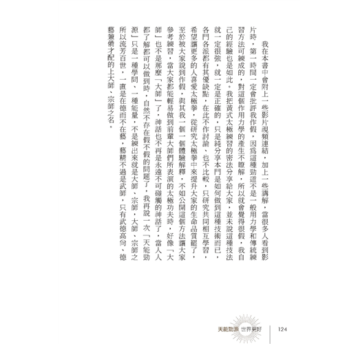 這些都將在本書用實例與方法與大家分享,希望對大家的生活品質,修性修命都有所幫助,至於不信者,民主社會大家都有表達不同意見的權利,當做喜劇笑話來看也無妨,但謾罵只是凸顯自身的修養不夠吧!總之「天能勁源」是一門學問,我從沒說過練出來就可天下無敵或者要運用其技能去騙取財富或沽名鈞譽。相反的,有了愈多的體驗,愈感受自己的渺小,只希望本書的一些觀點能給大家一點點啟發,共同研究推廣這學問,台灣不缺酸民與暴力,缺的是大家互相包容與互助再加上一點胸襟與氣度。