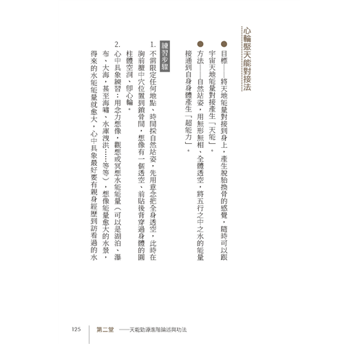 這本書一開始就很直白點出了許多現代人所面臨的一些心病,黃師父提供了消除這些心病的解方,透過潛意識及念力的開發,來更有效對接天地能量,最終達到身心靈之天人合一的境地。「正心」與「天能勁源」的修練可以說是相輔相成的:要有純正無邪的...