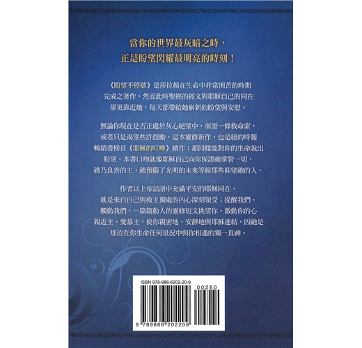 無論你現在是否正在處於灰心絕望中,極需一條救命索,或者只是渴望此許鼓勵,這本靈修新作,也是紐約時報暢銷書榜首《耶穌的叮囑》續作;都同樣能對你的生命說出盼望。本書口吻像耶穌自己向你保證衪掌管一切,衪乃良善的主,衪預備了光明的未來等候那些仰望衪的人。