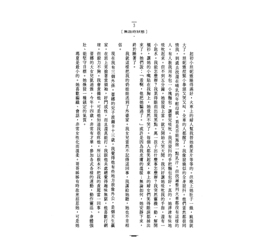 起初小坦妮雅睡得滿好,火車上的婦人幫我替她換尿片等等的。但晚上她肚子一餓,麻煩就大了。坦妮雅捏緊小拳頭又哭又叫,全車的人都醒了,我像發燒似的全身發抖。他們當然都很同情我,到處去找還在哺乳的年輕母親,看是否能施捨一點乳汁,但找遍整列火車都沒有這樣的人。有人教我用布包一小塊麵包,讓嬰兒吸吮。我用發抖的手把麵包包好,真的,她津津有味地吸吮起來。但不到五分鐘,她發現上當,就又開始大哭大鬧。我只好讓她吸吮我的手指,還有一小匙水。我能怎麼辦?我累得眼前出現黑點。萬一孩子出什麼事怎麼辦?我突然靈機一動,解開襯衫,讓她的小嘴貼在我胸上,她竟然不哭了。每個人都笑起來,車上的婦女們笑得眼淚都掉出來了。她們說;「看啊,他把她騙過了。」或許是因為我皮膚的溫暖;無論如何,她安靜下來,終於睡著了。