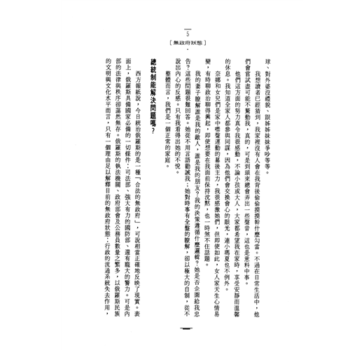西方報紙說,今日統治俄羅斯的是一種「合法的無政府」,可說相當正確地反映了現實。表面上,俄羅斯具備國家必備的一切條件;司法部、強大有力的國防部、還有龐大的警力。可是內部的法律與秩序卻蕩然無存。俄羅斯的執法機關、政府部會及公務員數量之繁多,以俄羅斯民族的文明與文化水平而言,只有一個理由可以解釋目前的無政府狀態;行政的流通系統失去作用,因此整個施政機器陷於停頓。所有的事都應該由公正嚴明的原則或法令規範;說得不客氣點,這國家需要有人管束,就這麼簡單。