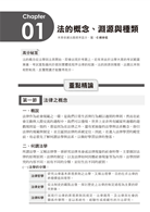 內容是為專攻測驗題,求取高分的你編寫。將重要的法律,如憲法、行政法、民法、刑法及訴訟法等,做一重點系統複習,從基本知識、法律制定、效力、解釋與適用、制裁,乃至於司法救濟與各別重要法律內容,一舉囊括,內容以粗體標示關鍵字、架構易讀好記,有助建立清晰的觀念,以掌握考試命題方向,而達其事半功倍之效,讓你在考前能夠將最精華的重點做一個回顧與記憶的強化。