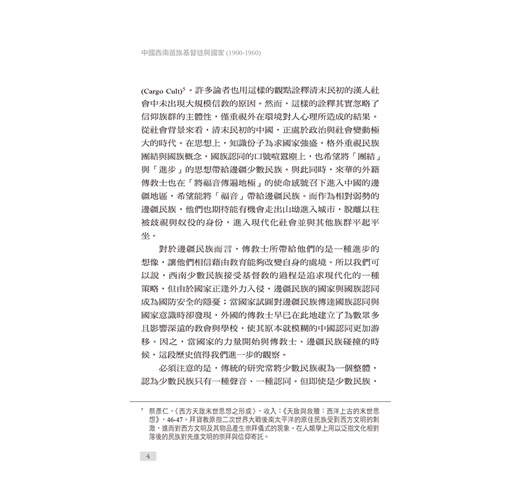 生轉而重視今世,致使宗教走上制度化;而本書主要關注的苗族,卻是將今世轉向了來生,在整個宗教發展史上是一個獨特的現象。傳統對於少數民族改信基督教的研究,多半將觀點歸因於基督教天啟末世思想(apocalypticism) 為他們帶來了盼望,使他們在社會或政治機制強大的壓力下獲得救贖,成為受壓迫者心理投射的極端產物,此即許多人類學研究中所稱的「拜貨教」(Cargo Cult)5。