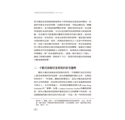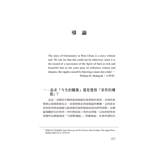 同時,本書的部分篇章也曾先後在不同的場合與期刊中發表過,包括〈基督新教循道會與中國內地會在黔西北苗族地區傳教工作之比較〉1與〈中央研究院歷史語言研究所中國少數民族藏品的來歷與蒐藏意義試析〉兩文部分內容成為本書的第一章與第二章的背景介紹;〈內地會教育事工在當代中國的再現—以貴州赫章縣葛布教會聖經學校為例〉與〈「今生的驕傲」或「來世的權能」?近代中國西南苗族基督徒的困惑與抉擇〉是本書第三章的骨幹;第四章則由〈從民族到國族—國民政府與貴州西北基督教會教育主權的衝突與合作〉 擴充而成;發表於《新史學》的〈1950 年代中國農村社會主義改造與苗族的「天啟末世」運動-以鬧升天、搬家與皇帝事件為例〉改寫成本書第六章;〈本色化運動下西南少數民族教會的靈恩運動(1920-1960)〉則橋接了從「今生」到「來世」轉變的第五章。感謝每篇審查人對拙文的建議與指正,使本書得以順利並有系統地擴增與整併。