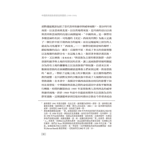 民初貴州西北地區大批苗族信徒的皈依而成為研究重點。這個區域剛好位於貴州、四川與雲南三省的交界處,以往的研究常常稱呼這個區域是「川滇黔邊區」。明確地說,本書所謂的川滇黔邊區應該包括了當代貴州省赫章與威寧兩縣、部分四川省南部,以及雲南東北部。以自然地理來說,是川南的凉山以南與貴州和雲南間的烏蒙山兩側區域。「中國西南」是一個帶有多種意涵的名詞。司馬遷的《史記‧西南夷列傳》為後人定義了一個位於中原王朝西...