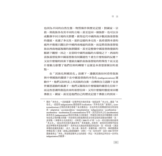 也因為不同的自然生態、物質條件與歷史記憶,對國家、宗教、與我族各有其不同的立場;甚至是同一個族群,也可以分成數個不同立場的次群體,使得近代中國西南少數民族基督教的發展,充滿了多元性。基於這樣的多元性,我希望將本書的視角不僅僅只關注於中國西南地區的苗族,而是將苗族基督徒放在西南地區複雜的族群關係,甚至是整個中國基督教發展的脈絡下觀察。因之,在當時中國所面臨的大環境之下,西南的苗族基督徒與中國基督教有何關連性?產生什麼相似的反應?又在什麼樣的因素下發展出屬於苗族基督徒的特殊性?而又是什麼動力影響了他們信仰的轉變?這便是本書想要探討的重點。