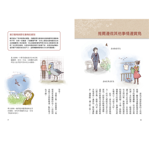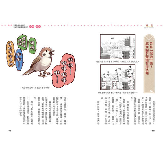 -圖鑑所沒有的生態說明很有趣。就連原本覺得平凡無奇的麻雀與鴿子,在了解其行為與叫聲之後,也會覺得他們看起來饒富趣味。