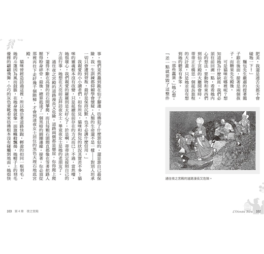 「現在她用後腿站起來,像人類一樣,」羅羅自言自語的說著,「她看起來真像惡魔!耳朵尖尖、尾巴長長的,加上跟墨水一樣黑的洋裝!」羅羅忍不住咬牙切齒,「她好像鎮上清理煙囪的傢伙喔,」他繼續說,「我真討厭她!不管我的小神明們怎麼說,我永遠也不會把她當成真正的人類……他們可真幸運……」羅羅嘆了一口氣說,「還好我懂的事情比他們要多太多了!」