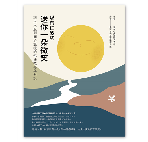 目前為止,這本《堪布仁波切送你一朵微笑》,是首次集結了仁波切歷來在一些較輕鬆的場合中所給的開示。當年的閱聽對象是一些年紀十多歲左右的孩子,或者是某一慶典活動的與會大眾,又或者是與一群淵源深厚、非常親近的弟子,師生之間依緣、隨興的就能展開一場難以界定、珍貴無比又終生銘記的佛法演釋。