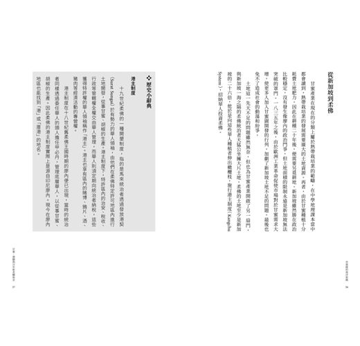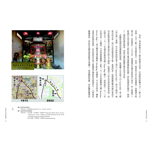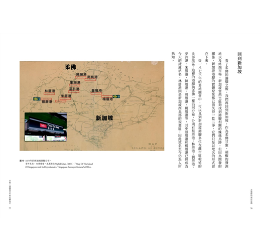 從歷史基因圖譜出發,此書先為我們勾勒馬來半島、新加坡,箇中涉及族群、信仰、經濟活動等開埠拓荒的地方脈絡。柔佛是偉權學術研究的起點,他的第一本專著《柔佛新山華人社會的變遷與整合:一八五五—一九四二》(二○一五)就是由碩士論文改寫而成,開啟他的區域地理學視點,從走訪義山、踏查墓碑,運用地理資訊系統(GIS),奠定了他對自然與人文地景的形塑與探究,展開區域研究的關懷與思考。因而此書開篇第一章從柔佛甘蜜、港腳的議題出發,深入淺出敘寫地方的墾殖史與華人移民、蘇丹王國及殖民者的複雜關係。箇中最有趣的部分,當屬如何透地理線索,為我們追蹤與鋪展今昔對照下的甘蜜與港腳往事。這類著眼地理關懷的歷史脈絡,其實深化了作者最想讓讀者探究的主題:我們如何透過地方的歷史與地理線索,勾勒其原初的人與環境的聯繫和關係。從甘蜜到港腳,前者是經濟作物,後者是貿易集散的地理概念,二者勾連的新加坡與柔佛關係,打開了一個重新建立在地方脈絡關係的地方史。