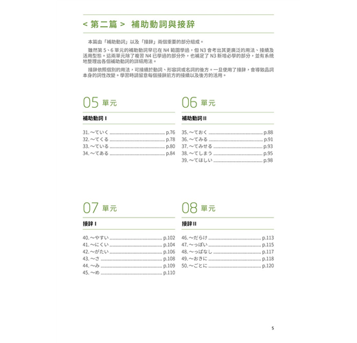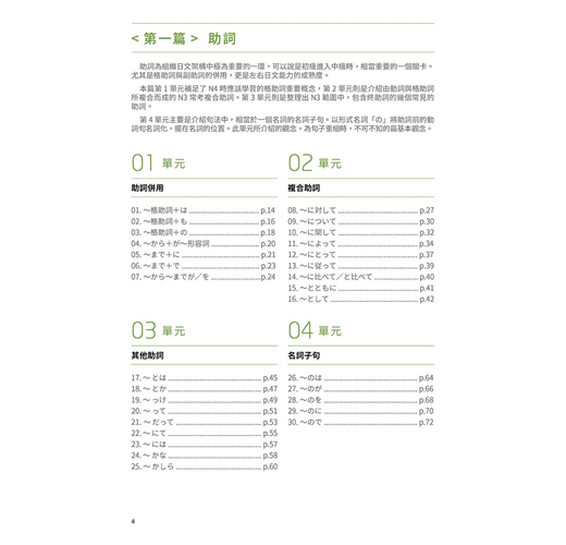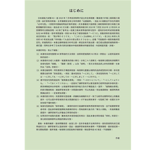 本書的編排,是依照難易度,由淺入深。且許多後面才出來的例句,會刻意使用先前已經學過的文法,讓學習者可以溫故知新。因此,建議學習者使用本書時,不要跳著看,最好是從第一單元開始閱讀,循序漸進。每個單元倘若能夠仔細研讀,相信要考過N3檢定,不是難事!