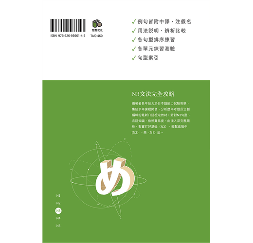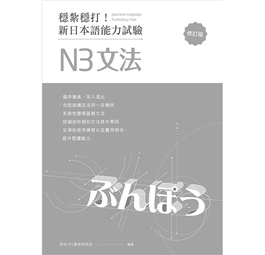 日本語能力試驗N3,是2010年7月考試改制時才設立的全新級數,難易度介於舊二級與舊三級之間。由於新制改制後,主考機關就沒有公布所謂的「出題基準」,因此N3級數並不存在著所謂的「必考句型」。坊間許多參考書編寫時由於無所適從,許多書籍就只是將舊二級較簡單的部分與舊三級較困難的部分挑出,組合成N3文法書。但經作者群詳細分析2010年7月至2018年12月份共18回實際考古題後發現,N3除了會考出一些舊三級未曾學過的新句型外,還有許多的考試項目都看似在N4時學過,但考得更進階。例如舊制三級考出了樣態助動詞「~そうだ」其動詞與形容詞的現在肯定的用法,如:「雨が降りそうです」、「このリンゴは美味しそうです」。但 2011年的七月份的N3考試就出題「何年働いても自分の家は買えそうもない」這種「可能動詞+樣態助動詞否定形」的進階用法。本書企劃時徹底分析考古題,將這些有可能出題、或已經出提過的進階表現一網打盡,同時也參考了日本具代表性的數本中級前期教材所編寫而成,內容相當完整、詳細。