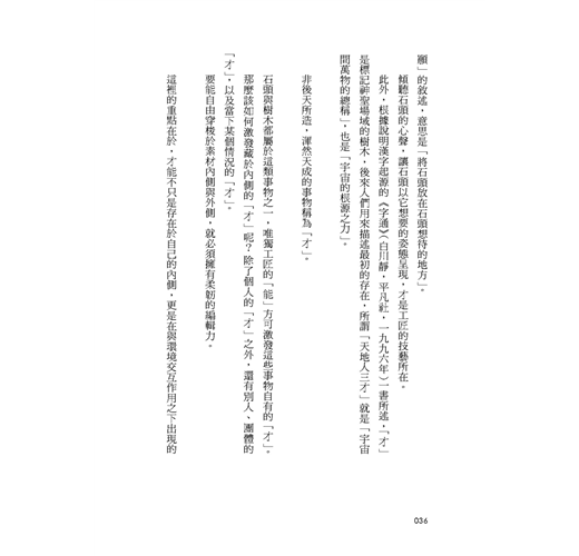 才能的「才」在日本的古語讀成「zae」,指的是石頭、樹木這類素材具備的特性,而讓這些特性得以發揮的能力稱為「能」。