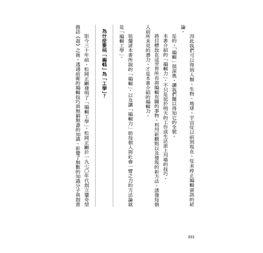 本書所指的編輯,是從新角度、新方法觀看世界和面對資訊與情報,藉此引出每個人與生俱來的潛能。