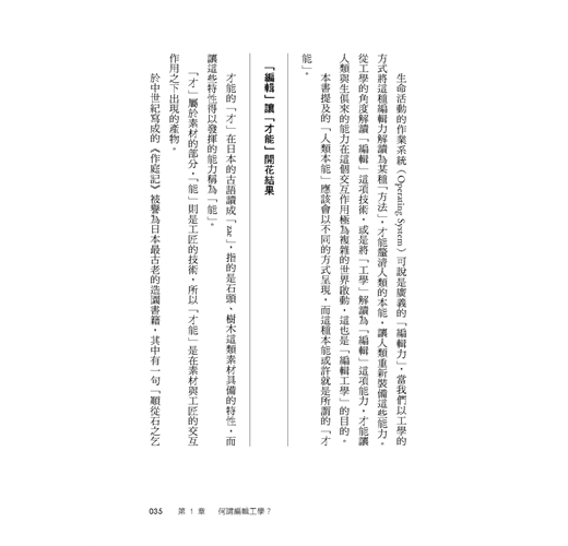 生命活動的作業系統(Operating System)可說是廣義的「編輯力」,當我們以工學的方式將這種編輯力解讀為某種「方法」,才能釐清人類的本能,讓人類重新裝備這些能力。從工學的角度解讀「編輯」這項技術,或是將「工學」解讀為「編輯」這項能力,才能讓人類與生俱來的能力在這個交互作用極為複雜的世界啟動,這也是「編輯工學」的目的。
