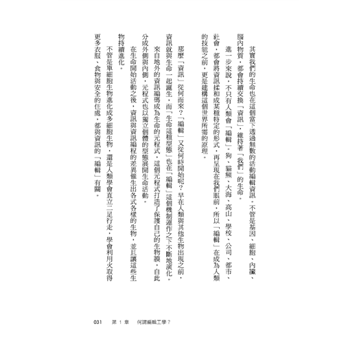 不管是單細胞生物進化成多細胞生物,還是人類學會直立二足行走,學會利用火取得更多衣服、食物與安全的住處,都與資訊的「編輯」有關。