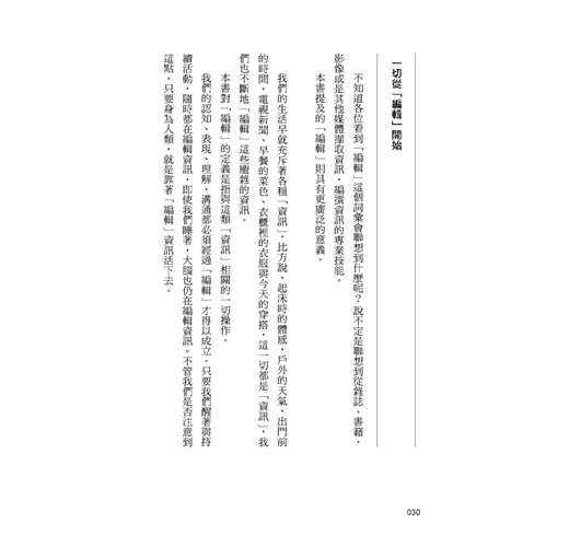 我們的認知、表現、理解、溝通都必須經過「編輯」才得以成立。只要我們醒著與持續活動,隨時都在編輯資訊,即使我們睡著,大腦也仍在編輯資訊。不管我們是否注意到這點,只要身為人類,就是靠著「編輯」資訊活下去。