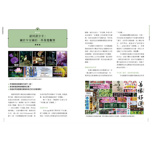 ●〈認同請分享:關於早安圖的一些視覺觀察〉──這篇文章從大家每天手機中會看到的長輩早安圖出發,文章甚至曾被三民教科書放入模擬試卷作為閱讀題組。文中更分享到印度早安圖現況,也有讀者轉貼相關文章印證。不少文章,也有讀者會分享一些延伸閱讀,沒想到早安圖跟藝術也有關吧!
