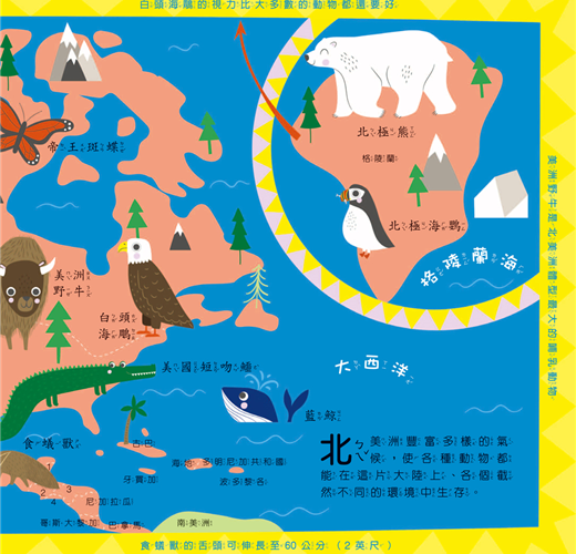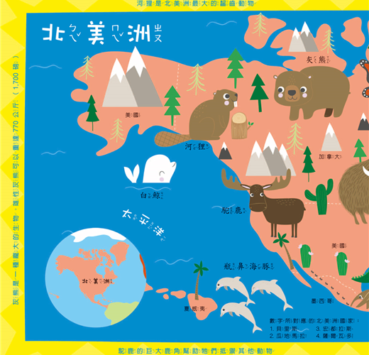 這是一本向小朋友介紹地球上各大洲、國家的野生動物地圖集