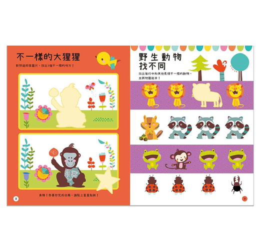 貼貼紙:每頁皆有設計黏貼處,有超多圖案豐富又可愛的貼紙,訓練孩子透過觀察形狀的變化,將貼紙貼上,並且在貼貼紙的過程,訓練孩子使用手指。