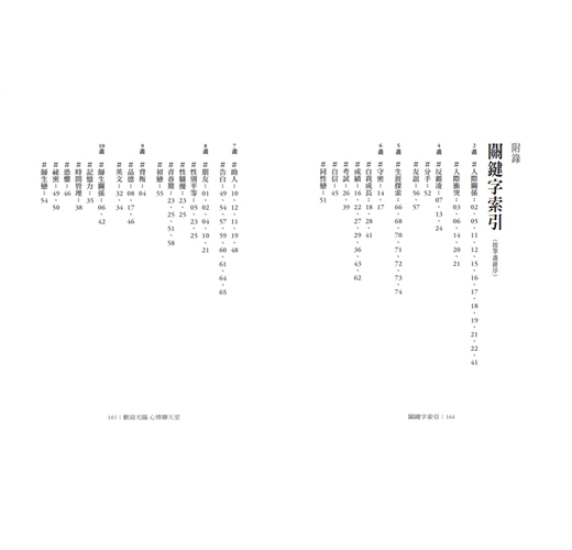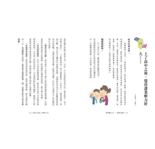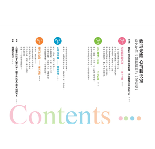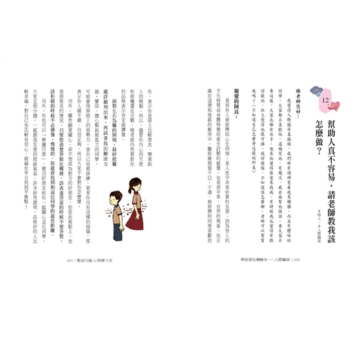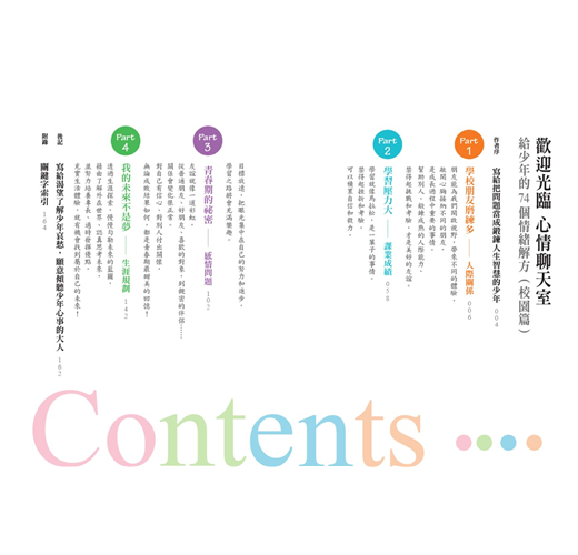 事實上,只要懂得用溫暖的同理心對待自己和別人,家庭和校園都可以成為解憂聊天室。因此,繼「家庭篇」之後,今年我將少年們在校園中碰到的各種疑難雜症集結成冊,希望這兩本書可以讓更多少年,在家庭和校園這兩個最重要的生活領域,都能順利通過考驗、克服挑戰,心理更加成長茁壯。