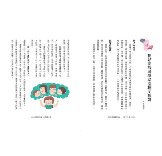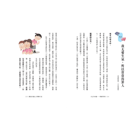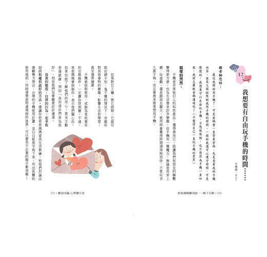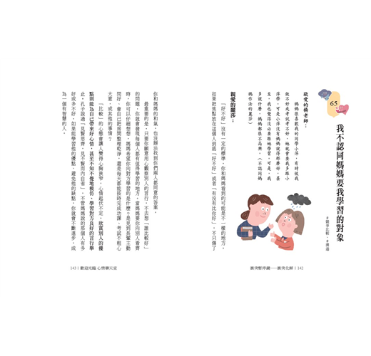 這本書將孩子常見的困惑收錄成書,由孩子真實說出煩惱所在,再以正向的文字循循善誘,引導孩子理解事件發生的可能原因或處理的心情,最後提供調解情緒的策略與步驟,改善與父母關係的建議,如建立感情存款、運用三明治法等,讓孩子無形中培養了面對困境與解決問題的核心素養。