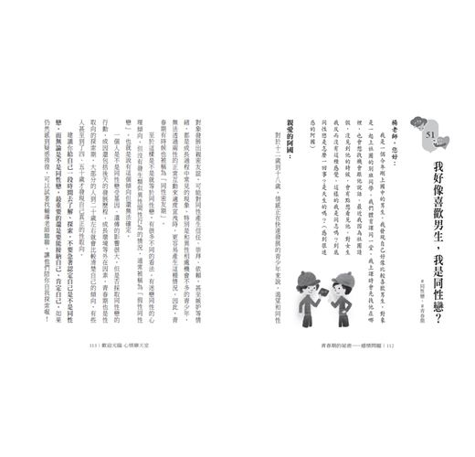 另外,我要特別感謝所有寫信來問問題的少年們。因為你們勇敢地分享心事,讓許多有類似煩惱的孩子知道,他們的心情有人了解、他們的問題有方向可以解決,讓他們感受到生命並不孤單、生活可以繼續向前!