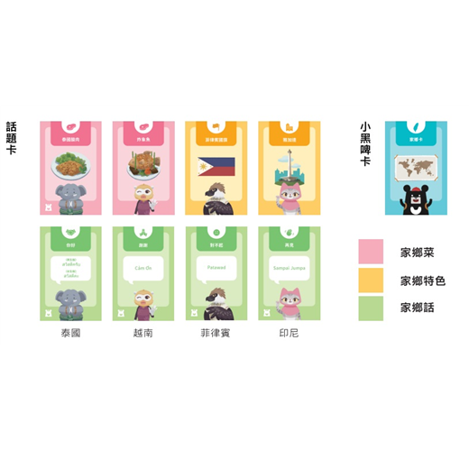 ●話題卡共60張(以4個國家區分家鄉菜、家鄉話、家鄉特色、小黑啤卡1張)