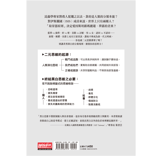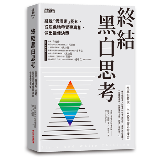 「《終結黑白思考》藉由許多社會現象,以及資訊傳遞背後所隱藏的種種認知誤區,引導讀者重新檢視二元思維帶來的困境。它不僅限制個人與社會發展,也容易引發非我即敵的對立與衝突。本書幫助讀者探索自己的思考模式、建立正確認知,並找出黑白以外的色彩來理解這個世界。」