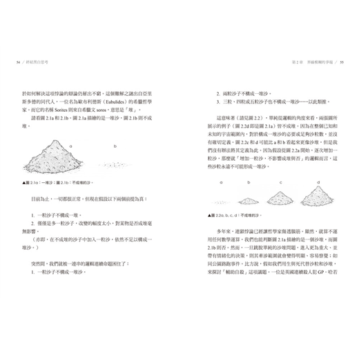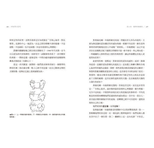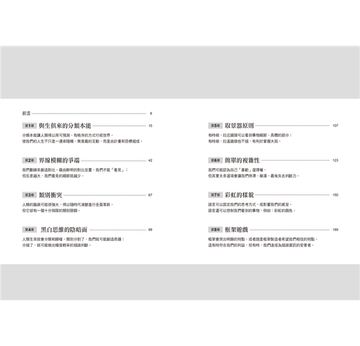 《終結黑白思考》是一本關於秩序的書,或者說,是關於秩序的錯覺。如同在牢不可破的現實沙漠中劃下一條線,那條線就像認知的海市蜃樓,越靠近其虛幻、短暫的形體,它就越快蒸發。在史前時代,人類大腦是純粹的初始狀態,運作平順、效率高,而且能精確地符合當時的生存目的。當遠古祖先偶然在岩石下發現了一條蛇,「此生物是否具有危險性」的判斷根本不適用,他們只會盡快離開那裡。同樣的情境也可以套用至灌木叢中的老虎,或是藏身蘆葦的鱷魚;有時可能只是風吹引發草動,但最佳上策還是保持安全、舒適的距離,遠離那些鋒利、尖銳或有毒的事物。