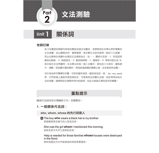 課文依主題式編排,由名師將各單元細分,以相關試題測驗你的基本程度,挑選出重要關鍵字予以標記,接著再整理其他重要觀念作為補遺拾缺,以期達到讓你在考前關鍵時間內快速複習、事半功倍的效果。