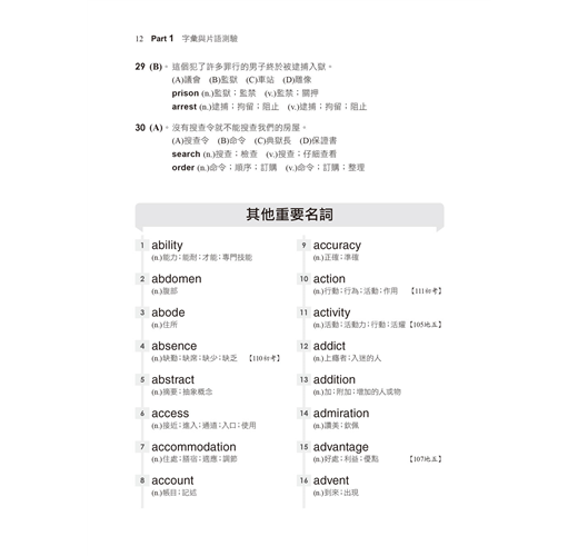 所有的大型考試,除了平日的認真準備,練習歷屆試題也是十分重要的,唯有練習歷屆考題才能清楚的掌握考試脈絡,有助於自己在考場上能臨危不亂,增加得分的機會。因此本書收錄106~111年試題及詳盡解析,除字句中譯外,並針對重要文法觀念加強說明,並有補充與註記重要單字,可多留意。