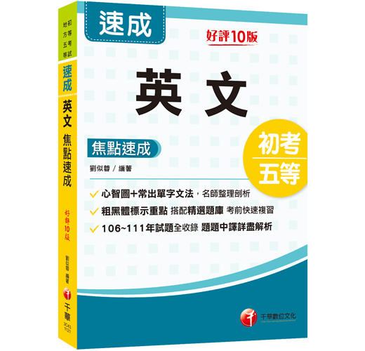 本書是為準備初等考試和地方五等考試所精心編撰,內容分為PART 1~6,將考試重要的觀念完整收錄,編寫方式不同於坊間其他國考用書的冗長論述,採清晰條列方式重點整理,不僅讓有基礎的人快速複習必考焦點,更有助基礎較薄弱的人重新建構英語文學習觀念!