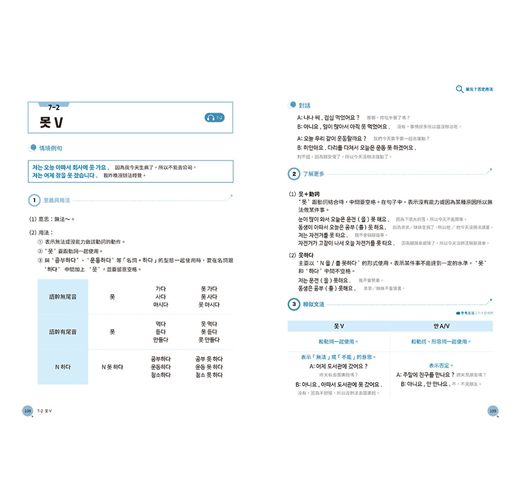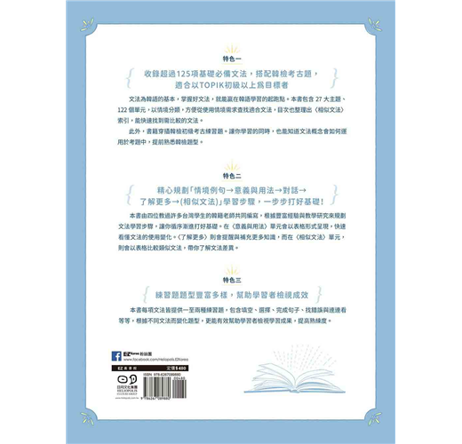 本書由四位教過許多台灣學生的韓籍老師共同編寫,根據豐富經驗與教學研究來規劃文法學習步驟,讓你循序漸進打好基礎。在〈意義與用法〉單元會以表格形式呈現,快速看懂文法的使用變化。〈了解更多〉則會提醒與補充更多知識,例如表示希望的「았/었으면 좋겠다」文法,雖然有「았/었」,但它並不是表示過去的期望。而在〈相似文法〉單元,則會以表格比較類似文法,例如「V지 말다、V지 않다、V지 못하다」都是表達否定的意思,但差別在哪?「-는 게 좋다、-는 게 좋겠다」都是用來表達希望或建議,但聽話者的感受會些微不同。本書會帶你了解這些語感差異。