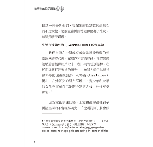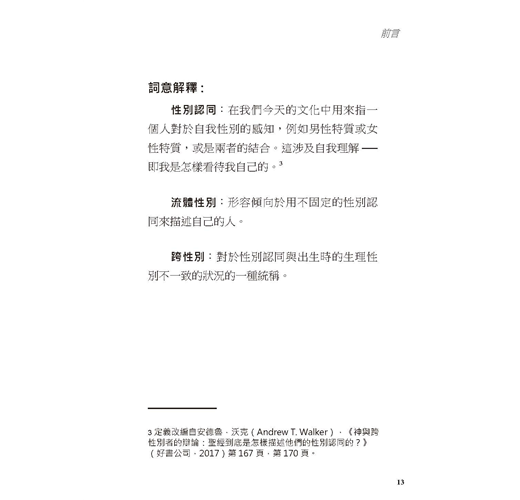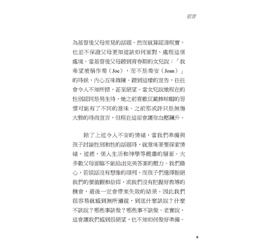 我們生活在一個越來越能夠接受流動的性別認同的時代裡。在寫作本書的時候,社交媒體網站臉書提供用戶七十一種不同的性別選擇。在近期經同行評審過的研究中,布朗大學行為與社會科學助理教授麗莎.利特曼(Lisa Littman)提出,在她研究的朋友群體中,青少年和大學的女生在宣布自己是跨性別者之後,往往更受歡迎。因為文化快速巨變,上文描述的這種親子對話短期內不會輕易消失。「性別認同」將會成為基督徒父母常見的話題。然而就算認清現實,也並不保證父母更知道該如何面對、處理這個處境。當基督徒父母聽到青春期的女兒說:「我希望被稱作喬(Joe),而不是喬安(Joan)」的時候,內心五味雜陳。聽到這樣的宣告,往往會令人不知所措,甚至絕望。當女兒說她現在的性別認同是男生時,她之前喜歡反戴棒球帽的習慣可能有了不同的意味。之前那或許只是無傷大雅的時尚宣言,但現在這卻會讓你血壓飆升。