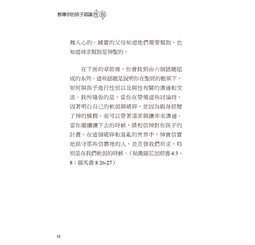 在下面的章節裡,你會找到由六個話題組成的系列。這些話題是說明你在聖經的框架下,如何與孩子進行性別以及與性有關的溝通和交流。我所禱告的是,當你在帶領這些討論時,因著明白自己的軟弱與破碎,並因為親身經歷了神的憐憫,而可以帶著溫柔與謙卑來溝通。當你繼續讀下去的時候,請相信神對你孩子的計畫。在這個破碎和混亂的世界中,神會信實地保守那些信靠祂的人,並且替我們祈求,特別是在我們軟弱的時候。(帖撒羅尼加前書4:3、8;羅馬書8:26-27)