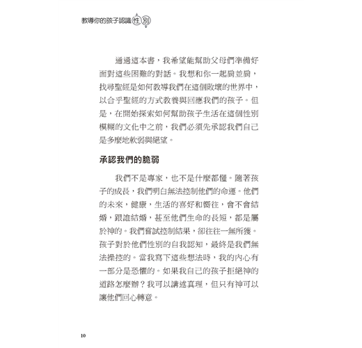 通過這本書,我希望能幫助父母們準備好面對這些困難的對話。我想和你一起肩並肩,找尋聖經是如何教導我們在這個敗壞的世界中,以合乎聖經的方式教養與回應我們的孩子。但是,在開始探索如何幫助孩子生活在這個性別模糊的文化中之前,我們必須先承認我們自己是多麼地軟弱與絕望。