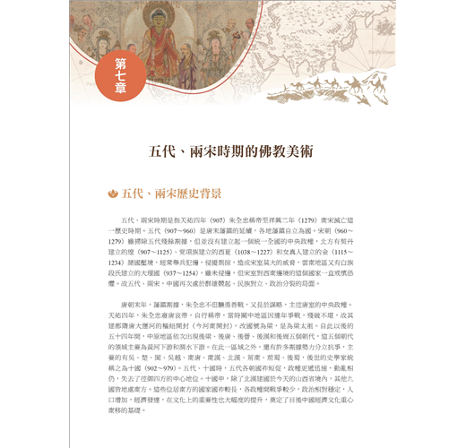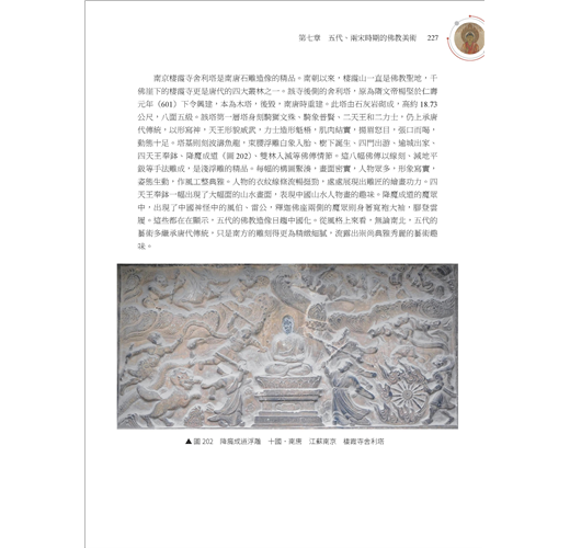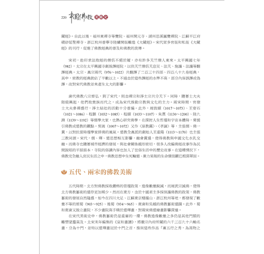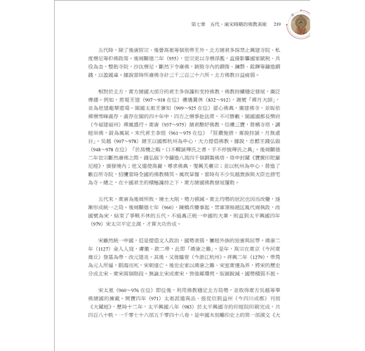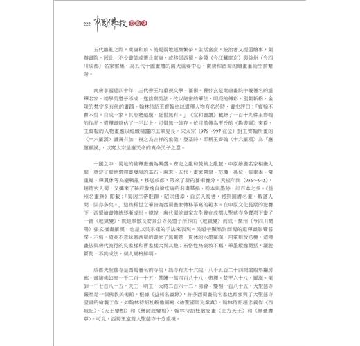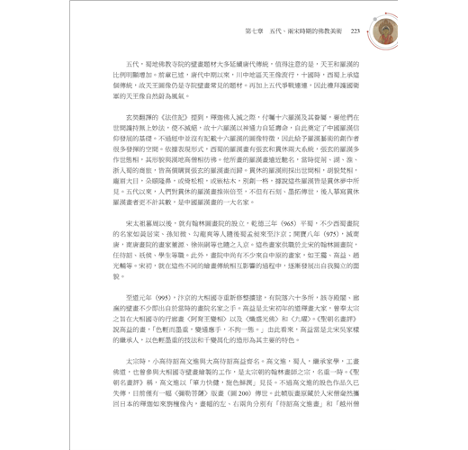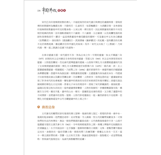 在內容部分,八章均有一定程度的增修,其中,又以第三章〈南朝佛教美術〉和第八章〈元明清佛教美術〉的幅度最大。即使如此,元、明、清三代長達六百四十年,佛教美術遺存數量龐大,而學界的研究卻相對薄弱,所以這一章有許多未盡之處,內容仍顯粗疏簡略。中國佛教美術史涉及的層面甚廣,建築、石窟、雕塑、繪畫、法器無一不包,同時對中國佛教史、思想史、考古等都需有所涉獵,本人因學力不逮,並非對中國佛教美術的每一面向與每一朝代均有深入研究,所以本書的內容主要是依據前人的研究成果,加以闡述而已,討論深度多有不足。又由於篇幅的關係,掛一漏萬的地方也必定不少。凡此種種,皆懇請讀者見諒與指正。