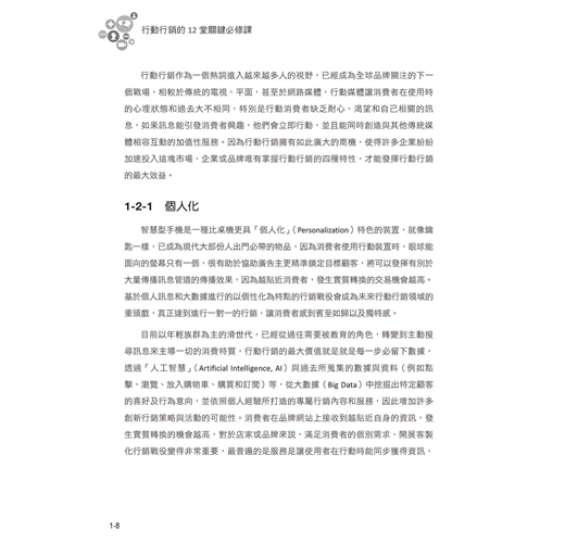本書適用於對行動行銷感興趣的讀者,不管是行銷人員、開店老闆、社群管理員、網站設計和產品企劃人員、App開發者以及相關網際網路從業人員,書中包含了最詳盡行動行銷的觀念解析,完整且詳實介紹行動行銷相關議題、重要觀念及最新行動行銷工具。精彩篇幅包括: