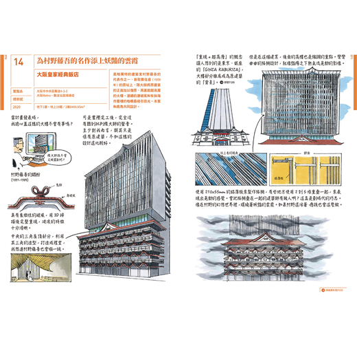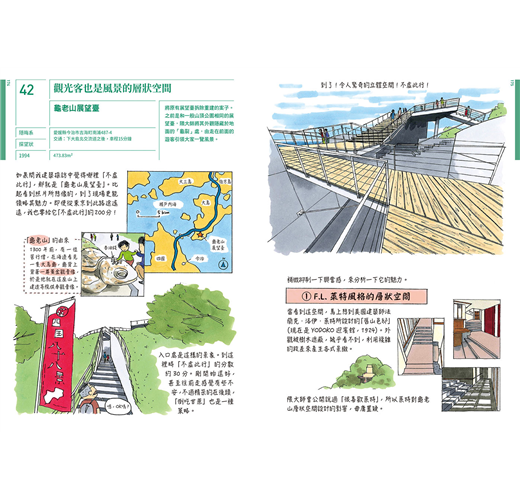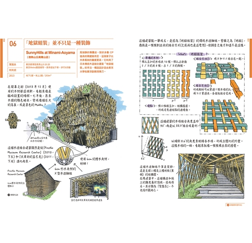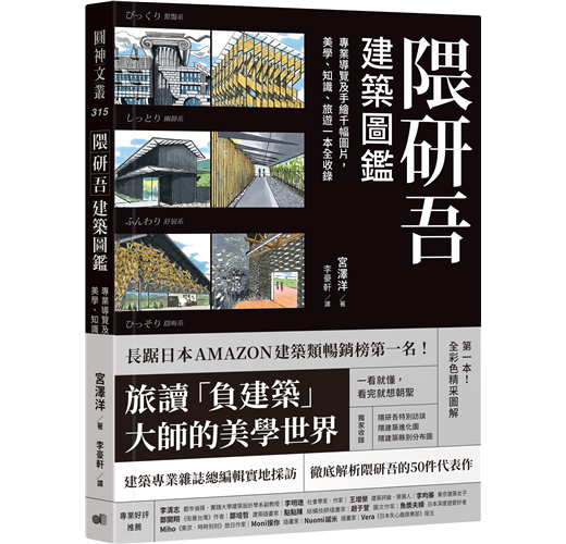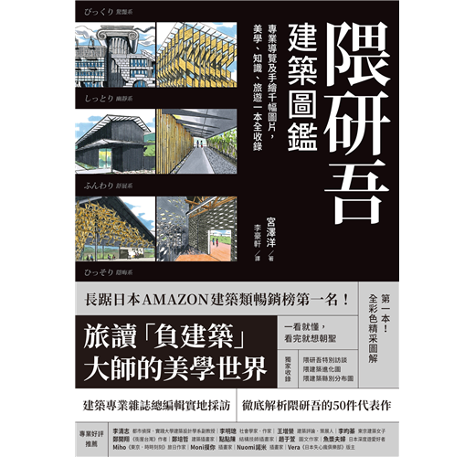 本書由曾任建築專業雜誌《日經Architecture》的總編輯,現為圖文作家的宮澤洋,實際探訪隈大師30多年來最具代表性的50件建案,以「驚豔系」「幽靜系」「舒展系」「隱晦系」分類,藉著千幅精美彩色插畫詮釋,鉅細靡遺地展現出其中的創意與趣味。