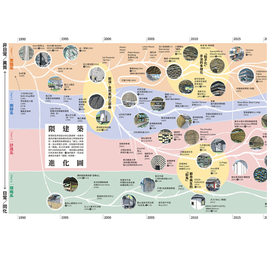 【隈建築進化圖】:以樹狀圖呈現隈研吾重要建築的歷程。