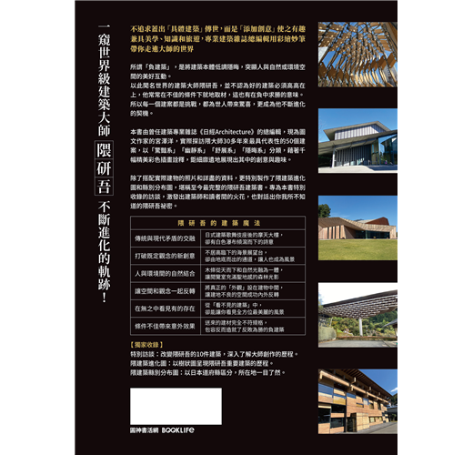 除搭配實際建物的照片和詳盡的資料,更特別製作了隈建築進化圖和縣別分布圖,堪稱至今最完整的隈研吾建築書。專為本書特別收錄的訪談,激發出建築師和讀者間的火花,也對話出你我所不知道的隈研吾祕密。
