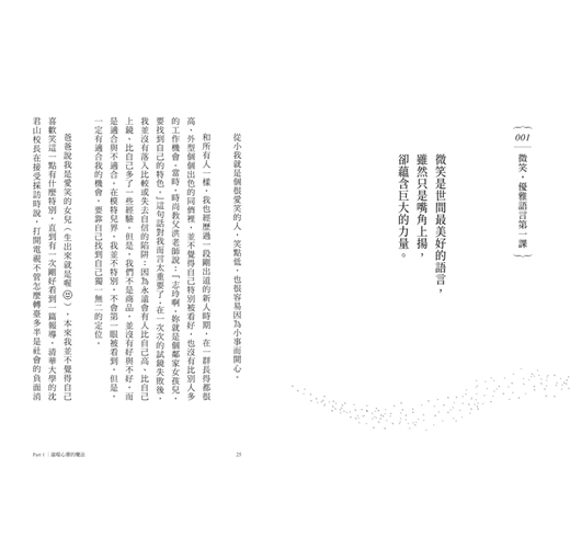 我曾讀過一本外國翻譯書《凝視優雅》,初版即榮獲「博客來二○一六年九月選書」,以氣質女星奧黛麗‧赫本(AudreyHepburn)黑白照片為封面,相當搶眼,書中的論述內容也令我難忘。其中有一段:「優雅,存在於溫暖包容的態度中,流轉於從容自在的肢體動作間,兩者經常並存。」多年以後,讀到《剛剛好的優雅》書稿,大為驚豔!林志玲正好是溫暖包容的態度(內在),與從容自在的肢體動作(外在)兩者並存的代言人。我讀過不少國內外藝人相關的書,也讀過以優雅為主題的著作,而由藝人親自論述的優雅主題書,這是第一本!